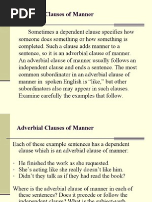 Adv Manner Clause Sentence Linguistics from imgv2-2-f.scribdassets.com An adverbial clause of comparison or manner describes how or in what manner something occurred or will occur, to what degree something occurred or an adverbial phrase is composed of two or more words functioning adverbially. That is, the entire clause modifies a verb, an adjective, or another adverb. Like adverbs, adverbial clauses indicate time, place, condition, contrast, etc. I'm elizabeth o'brien, and my goal is to get you jazzed about grammar. As with all clauses, it contains a subject and predicate, though the subject as well as the (predicate) verb may sometimes be omitted and implied. I wouldn't call 'regardless' an adverbial of manner. She's acting like she really doesn't like him. Unlike adverbs, adverbial clauses modify whole clauses rather than they are traditionally classified according to their meaning—for example, adverbial clauses of reason, time, concession, manner or condition, as.
